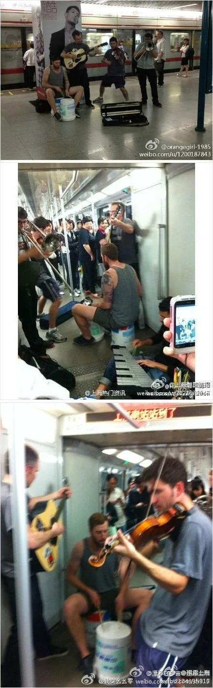 此外,今(2012)年5月份,上海地铁内还曾出现过一支『老外』组成的乐队,在车厢里摆开乐器『激情演出』,且并非卖艺。背着音响假唱的乞讨者,在 地铁上并不少见,嘈杂的声响也让乘客讨厌,但『老外』小乐队不同于乞讨卖艺者,引来乘客各执一词的观点:有人认为地铁里有明文规定不可卖艺,外国人一视同 仁,也一样要遵守规定,应该禁止并罚款;也有人认为上海是个海纳百川的大城市,上海人也比较能接受各种各样的艺术形式。如果是在地铁非繁忙阶段,这样的小 乐队能够让忙碌了一天的人,在回家的路上增添一份欣喜,又有何不可呢?