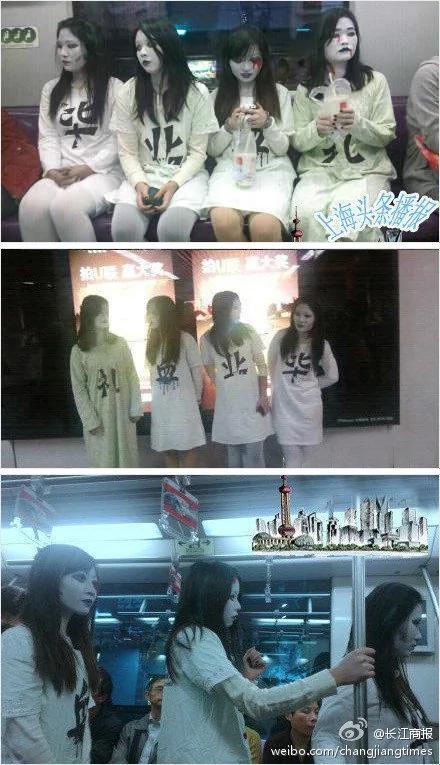 10月31日是西方的万圣节,随着英语的普及,沪上不少白领也兴起了过万圣节。去(2011)年11月1号,形形色色的鬼出没于各大城市的地铁车厢,而就在昨(10/31)天,一队殭尸出现在上海地铁内,开始为节日预热。那么,如此行为出现在车厢里是否合适呢?