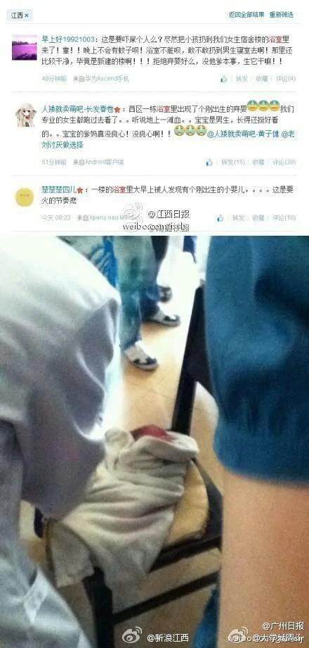 【大三女生产子遗弃于浴室】东华理工大学(南昌校区)西区一栋女生浴室,今早8时许发现一名刚出生的弃婴,宝宝是男孩。下午17时许,校方确认弃婴母亲为该校一名大三女生。目前,学校已经通知女生家长,并对这名大学生妈妈进行了妥善安置。@江西日报