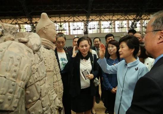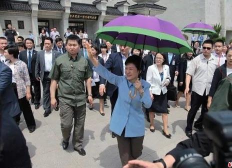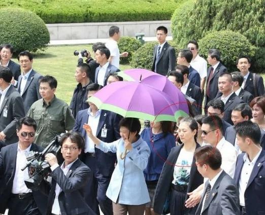 6月29日至30日,韩国总统朴槿惠在陕西访问,记者用镜头记录下了女总统身边安保人员的工作状态。6月30日,在秦始皇帝陵博物院,保镖站在韩国总统朴槿惠身边,为朴槿惠开路。