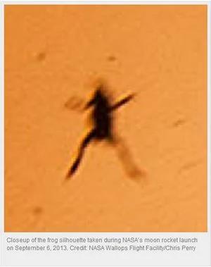 报导说,「据美国《大西洋月刊》杂志9月11日报道,上周五(9月6日)晚上,NASA的米诺陶五号火箭从佛吉尼亚的发射台升空,携带LADEE探测器踏上月球之旅。场景壮美,激动人心,史诗浩荡。但也免不了有所牺牲,据一个远程相机拍摄到的图片显示一只青蛙被火箭发射的气流吹上了天。」