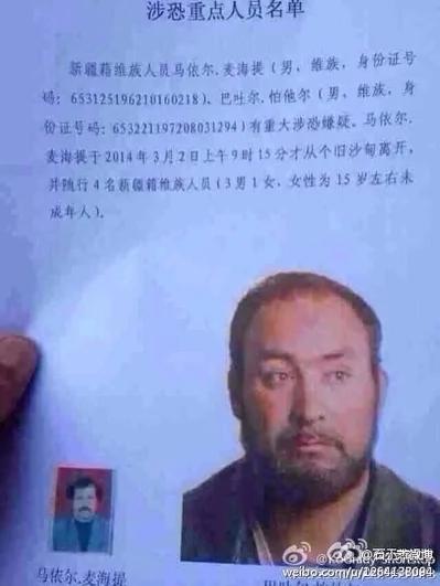 网上被删的通缉令为“涉恐重点人员名单”,新疆籍维族人员:马依尔、麦海提,男,巴吐尔.怕他尔,男,有重大涉恐嫌疑,并有二人具体身份证号码。“马依尔、麦海提于2014年3月2日上午9点15分才从个旧沙甸离开,并随行4名新疆维族人员(3男1女,女性为15岁左右未成人)。在通缉令的下方还有这二人的大头照。