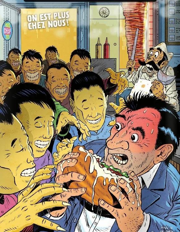 与《查理周刊》齐名的法国幽默讽刺漫画杂志《寒流》(Fluide Glacial),在1月15日的最新一期中以“黄祸已至,挡之晚矣?”为封面故事,以漫画描绘中国人占领巴黎的街景。