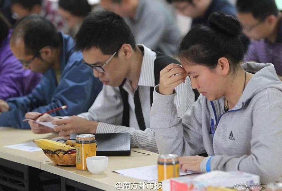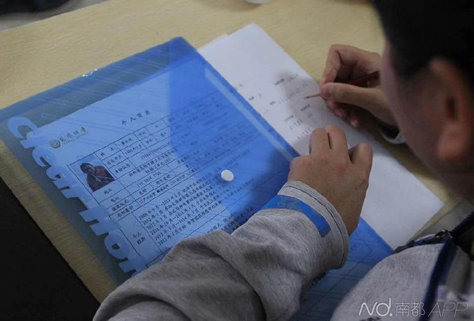 一位女考生非常认真拿出自己的简历,对着抄自己的一些信息。