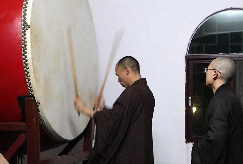 不少应聘者感叹现在寺院条件感觉不那么艰苦了。万行说,这是赶上好时代了,不可能再艰苦了。政府在政策很鼓励,建设寺院方面是免税的。万行从2013年有了自己的微信。现在他每天都看微信。每天吃完早饭第一件事情,就是看微信,半个小时。他会在各种群里回复。现在东华禅寺有自己的寺庙微信群,和外面信徒好多微信群。寺庙活动、政策都在群里发布。万行说自己并没有鼓励和尚们用微信,因为“不用鼓励,看自己的需要”。万行说自己不会用微信发布自己的生活工作,思想都在寺庙网站传递。微信主要用于给信徒答疑解惑。图为东华寺,僧人们做早课击鼓。