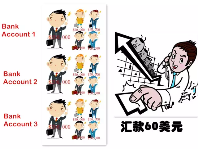 这是一个相对来说安全、成本低,但战线长、操作有点繁琐的方法。比如,请三位亲朋好友各开一个境外帐户,每位朋友再邀请四位朋友各购汇等额5万,总额不超过20万的美金,汇到他们的境外帐户。这样这三位朋友每人境外账户中的20万美金再汇到客户的帐户里,即可获得60万美金,用作海外投资。