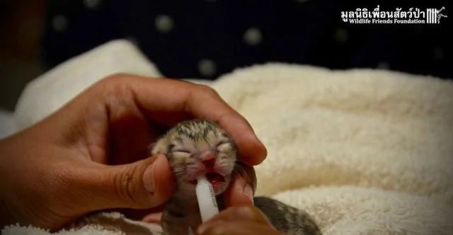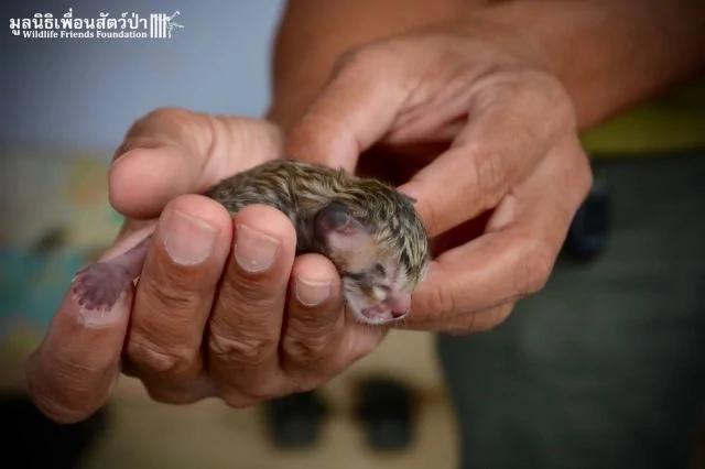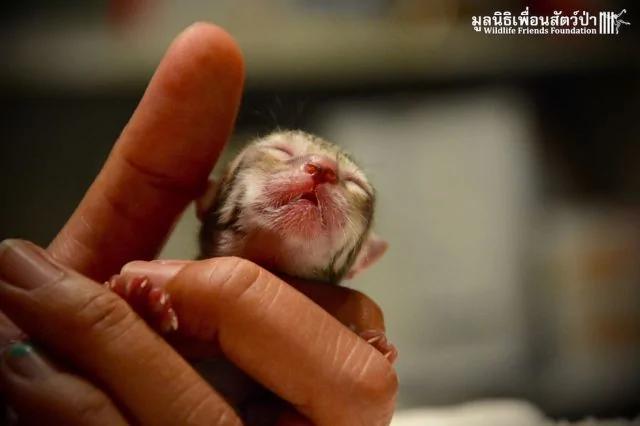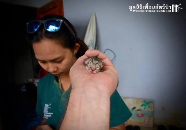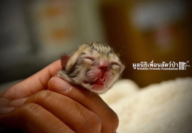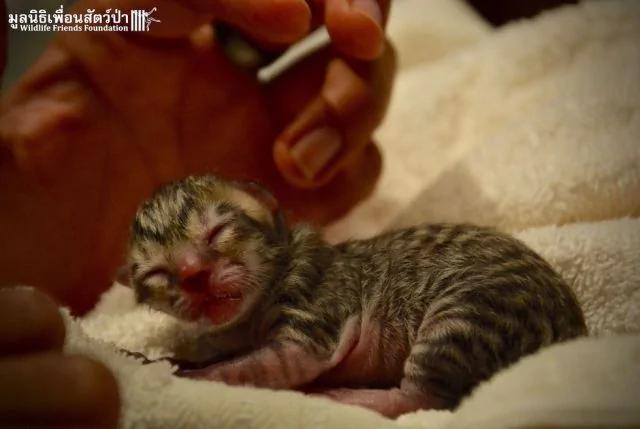 泰国野生动物友好基金会(WFFT: Wildlife Friends Foundation Thailand)接到报警电话,对方表示路边有一只刚出生的小猫,似乎是,但又不太像家养的狸猫。