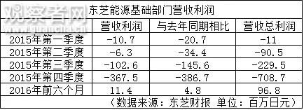 (由于2016年底购买的美国核电企业超出预期,从原先预计的盈利1450亿日元(87亿元人民币)下调至亏损3900亿日元(234亿元人民币),债务将超出资本1500亿日元(90亿元人民币)。2016年第三季度股本降至负1912亿日元(115亿元人民币),其中核电业务亏损7125亿日元。)