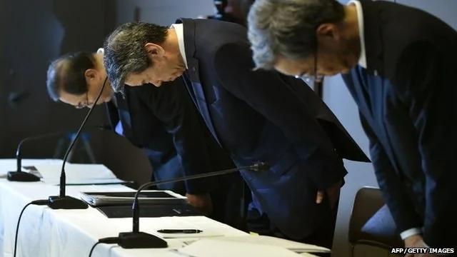 2015年7月,东芝前后三任社长因造假丑闻鞠躬道歉