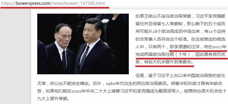 博闻社报导还指,在这些推定的候选人中,只有两个,即李源潮和汪洋,将在2017年完成两届政治局任期(十年),因此具有资历优势,有较大机会晋升到常委会。