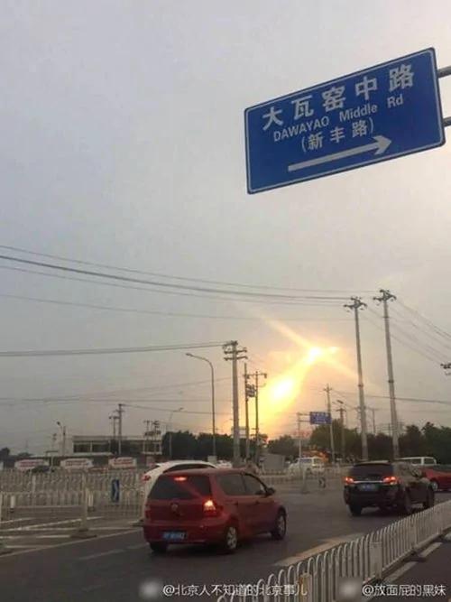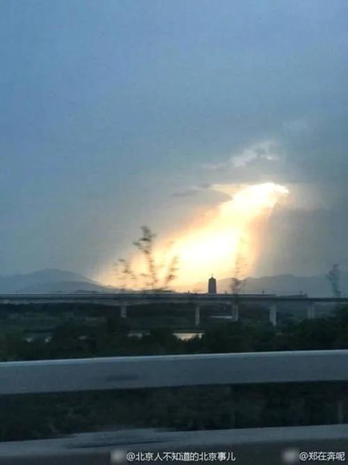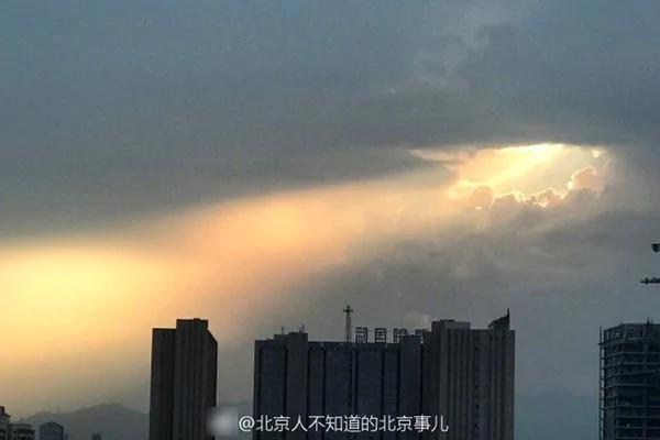 8月8日下午,北京天空惊现金色光柱,穿过蔼蔼云层中一个小孔直射大地。一种神圣静谧的感觉油然而生。