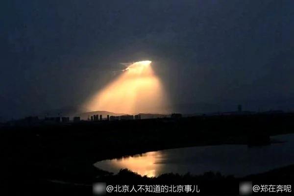 8月8日下午,北京天空惊现金色神光,一束金光穿过蔼蔼云层中一个小孔直射大地。(网络图片)