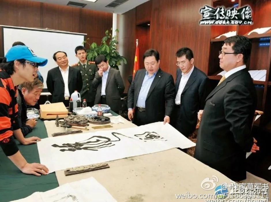 作家草军书:这张照片拍得真传神,完全是一幅中国社会生态图:权贵王立军题完字,一副王羲之都不在话下舍我其谁的神态;也经常写字的赵大叔心里可能不服,但却假装虔诚欣赏;小沈阳长大嘴巴惊叹,一副演艺人士献媚权力的典型表情;雷政富很职业地赞赏表情,徐明一看就有钱:这幅传世书法我买了