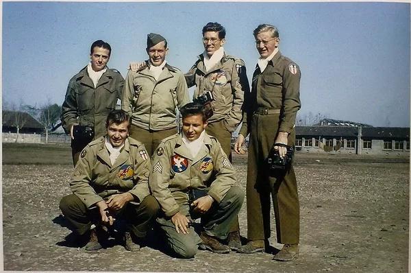战争结束了,在中国的美国士兵欣喜地穿上干净的夹克,戴上白色的围巾,摆出姿势照相。(艾伦·拉森摄)