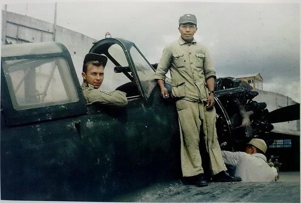 艾伦与一名民国空军技师在一架缴获后被翻新的日军战机上。(威廉·迪柏摄)