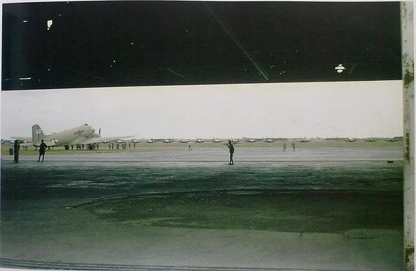 遭战争破坏的飞机修理库外停放着美军运输机和战斗机,建筑物上布满弹孔。(艾伦·拉森摄)