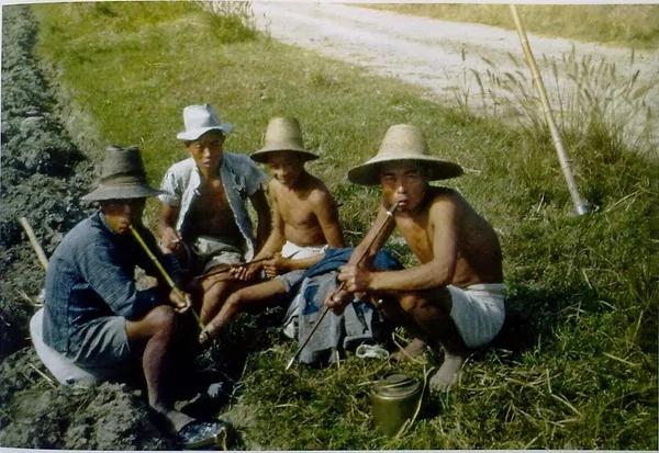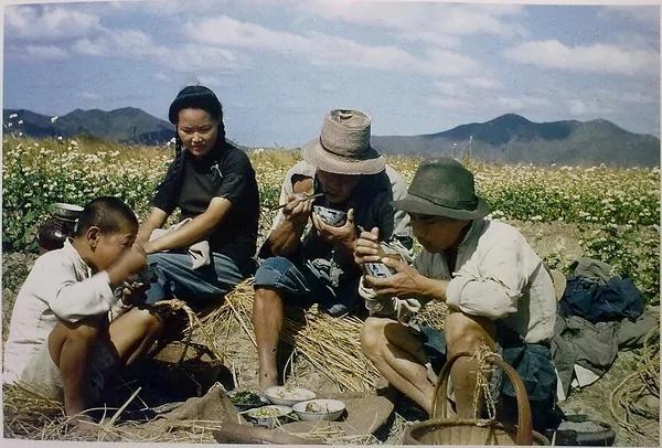在田间歇息吃饭的农民一家人。杭州地区的乡村引起我和几个战友的极大兴趣。在机场附近田野里耕作是当地的主要活动,1945年秋天温和的天气最益于各种农场的好收成。农民们及其家人打着手势友好地接待我们,并且乐意让我们拍照。(艾伦·拉森摄)
