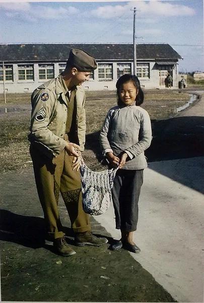 美军在杭州的军旅生活稍许轻松一点,我们住在曾经是仓库的建筑内。当地的百姓为美军提供一些基本的服务,如这个年轻女孩正在军营附近帮艾伦运送一袋要洗的衣服。(威廉·迪柏摄)