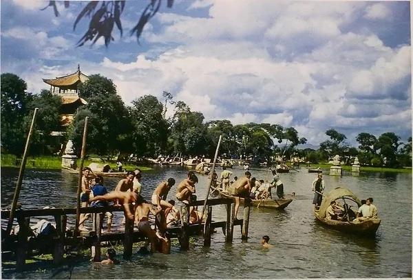 滇池是昆明最重要的游览地,对当地居民和美国士兵的生活、工作和娱乐都有重要的影响,它是游泳、潜水和划船的最佳场所,大观园是其主要的景点,园内有壮观的大观楼,一座保存完好的木质宝塔,点缀了滇池的湖岸。(艾伦·拉森摄)