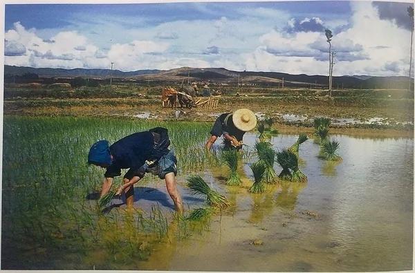 村民正在耕种田地。靠近我们基地驻扎宿营地区有一座很大的村庄,那里有许多机会拍摄村里的人们从事各项活动,如插秧、洗衣服、照顾孩子等场景。(艾伦·拉森摄)