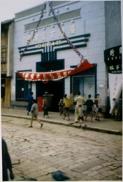 1944年11月间,在昆明的某家商店门口有一座用色彩鲜艳、用纸花装饰起来的大花轿子。由几个壮汉抬着去举行婚礼。(威廉·迪柏摄)