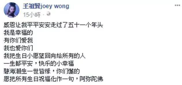 王祖贤在facebook上道出近年来心声,她表示:“感恩让我平平安安走过51个年头,我是幸福的,有你们爱我,我也爱你们”,为了感谢粉丝多年不离不弃,愿意将今年生日愿望回向给所有人,并希望众人“一生都平安,快乐的小幸福。碧海潮生一世皆缘,你们懂的,愿把所有生日祝福化作一句,阿弥陀佛。”
