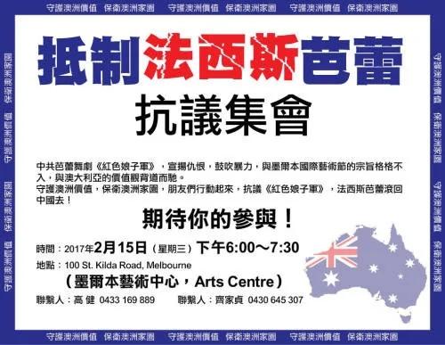 中共文革时期八部「革命样板戏」之一的芭蕾舞剧《红色娘子军》,受澳大利亚维多利亚州政府推荐,2017年在墨尔本艺术中心首演。这一演出遭到澳洲华人团体澳洲价值守护联盟的抵制!
