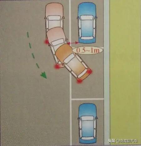 (2)挂倒档,将转向盘向右转至极限位置。确认安全后,开始缓慢倒车。在倒车过程中,注意保持车身距离前车左后角0.5~1m。