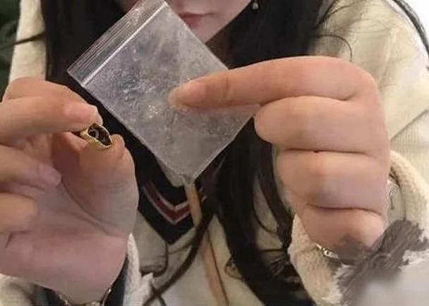 许女出示被火烧后的足金小熊及银白色灰烬。(互联网)