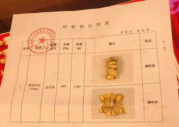 许女上周二(12日)到位于渝中区解放碑的重庆市金银饰品质量监督检验站,支付300元(约356港元)检测,结果显示小熊饰品黄金含量为999,为足金。该站站长邹云表示,正常的足金熔炼的确大多是液体状,但该小熊饰品使用了近几年兴起的3D工艺,里面是镂空的,这有可能是工艺不同所致。