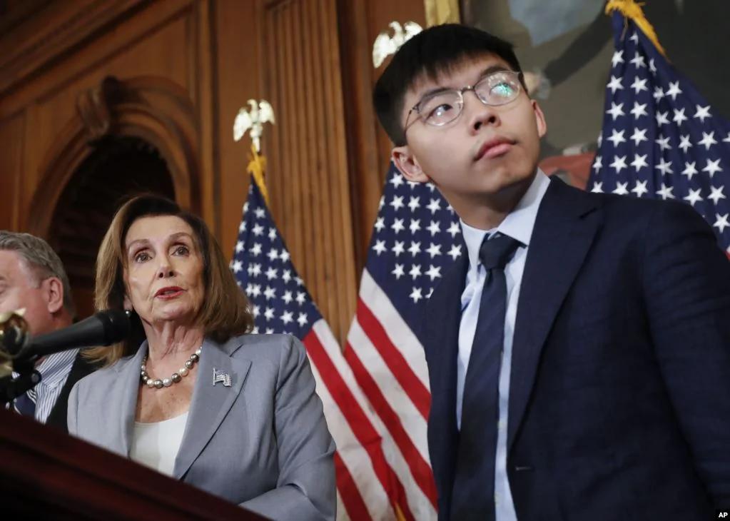 2019年9月18日美国众议院议长佩洛西(左)与香港活动人士黄之锋以及其他美国会议员在首都华盛顿国会山举行香港人权问题记者会。