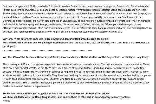 2019年11月19日,柏林工业大学学生会在其官网公开声明,力挺香港理工大学示威者,并要求警方停止暴力和撤出校园。(柏林工业大学学生会官网)