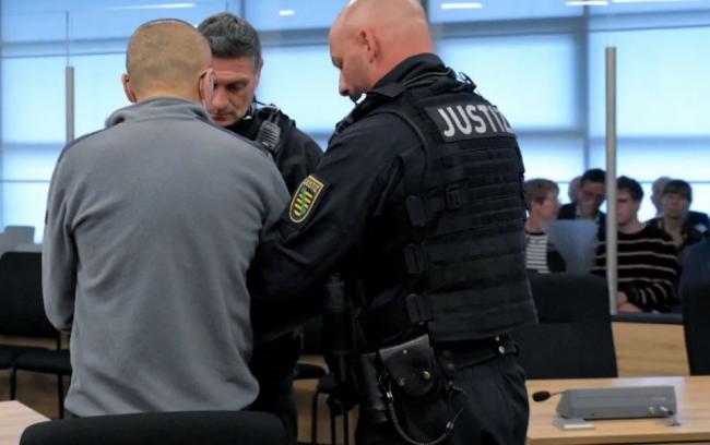 被控涉为中国从事间谍活动的郭健2025年9月30日遭判囚4年9个月,图为网上图片显示郭健被押送出庭。(X@tr724nl)