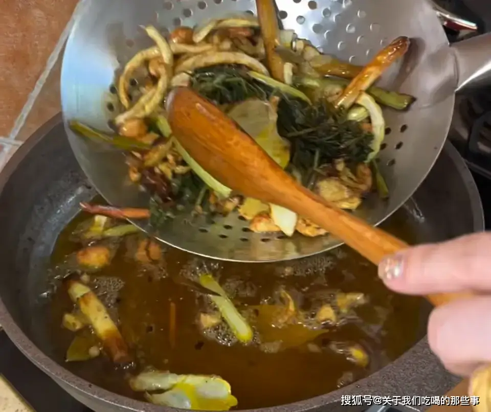 锅内加油开火,把蔬菜部分和香料部分都放进去,小火慢炸,时不时拨动几下,受热均匀,充分炸出香味。一直炸到表面金黄,用漏勺捞出,让油变得干净无渣。