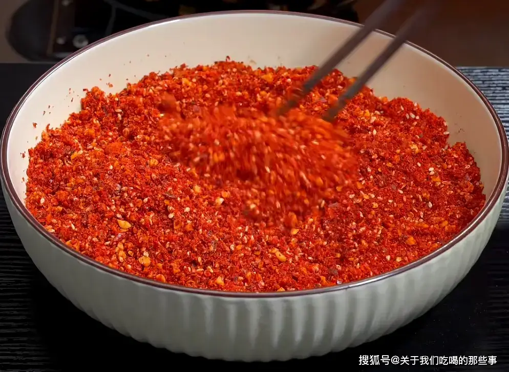 第三,给辣椒面倒热油,不要一股脑倒进去,记得分三次,这样去做一方面避免炸糊,另一面可以激发出辣椒面的香气、辣度和红亮色泽。