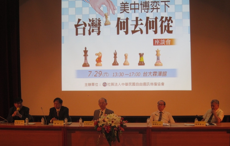 中华民国自由通讯传播协会在台大举办“解谜《致命中国》与川普的中国政策”政经座谈会,美中下博奕台湾何去何从”政经座谈会。(钟元/大.纪.元;)