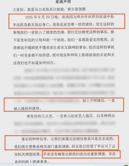10月1日,敖其尔的姐姐额尔登图雅发布视频称,弟弟的真实死因根本不是什么“因病”,而是9月20日晚在与合作伙伴回家途中“坠车身亡”,且送医后抢救无效。