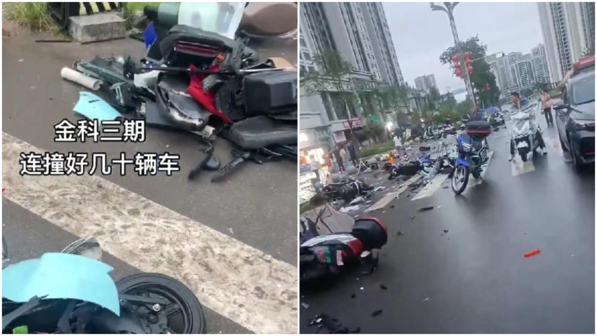 10月4日,网上传出大量视频显示,邻水县金科三期的街道上满地狼藉,到处都是汽车碎片以及电动单车的残骸。一排排汽车的车尾被撞坏,大量电动单车被撞烂,倒在地上。