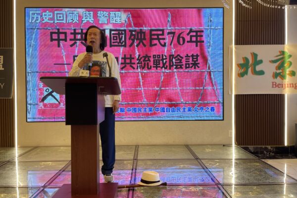 诗人黄翔在“中共祸国殃民76年-反击中共统战阴谋”纽约研讨会上发言。(黄翔提供)