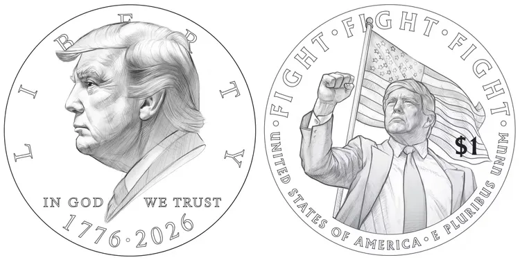 草图显示,硬币正面是川普的侧面肖像,上方刻有“Liberty(自由)”,下方写着“In God We Trust(我们信仰上帝)”以及年份1776与2026。背面则描绘了川普在宾州巴特勒(Butler)遇刺未遂后高举拳头的经典画面,背景是一面随风飘扬的美国国旗,上方印有FIGHT FIGHT FIGHT字样。