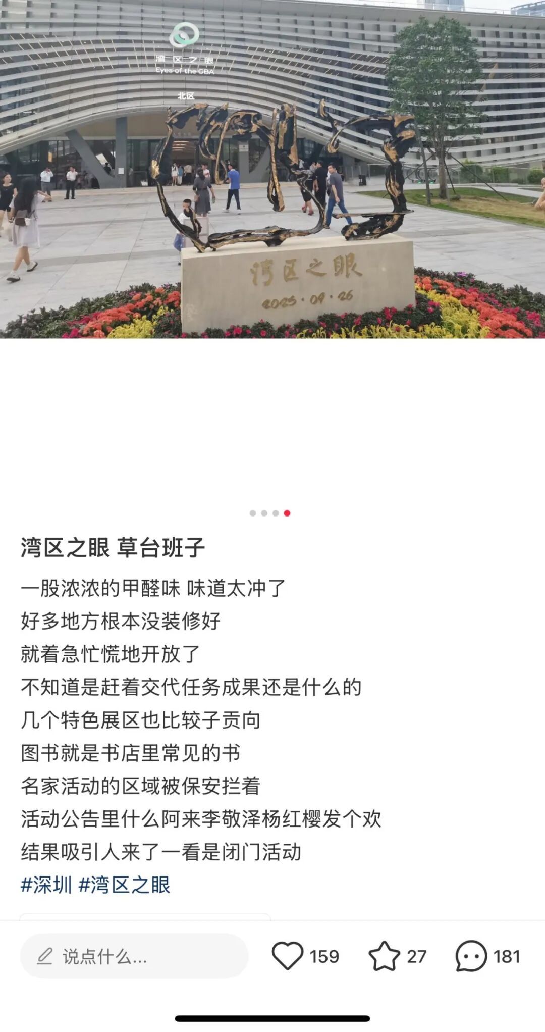 3、速度:“剪彩仪式”综合征。这是一个所有“献礼工程”都难以摆脱的魔咒。“湾区之眼”从立项之初,就被冠以“新时代重大文化设施”的名号,由深圳出版集团这家市属国企亲自操刀。它的开业日期——9月26日——被早早地公之于众,成了一个必须兑现的军令状。