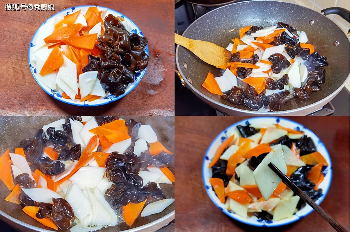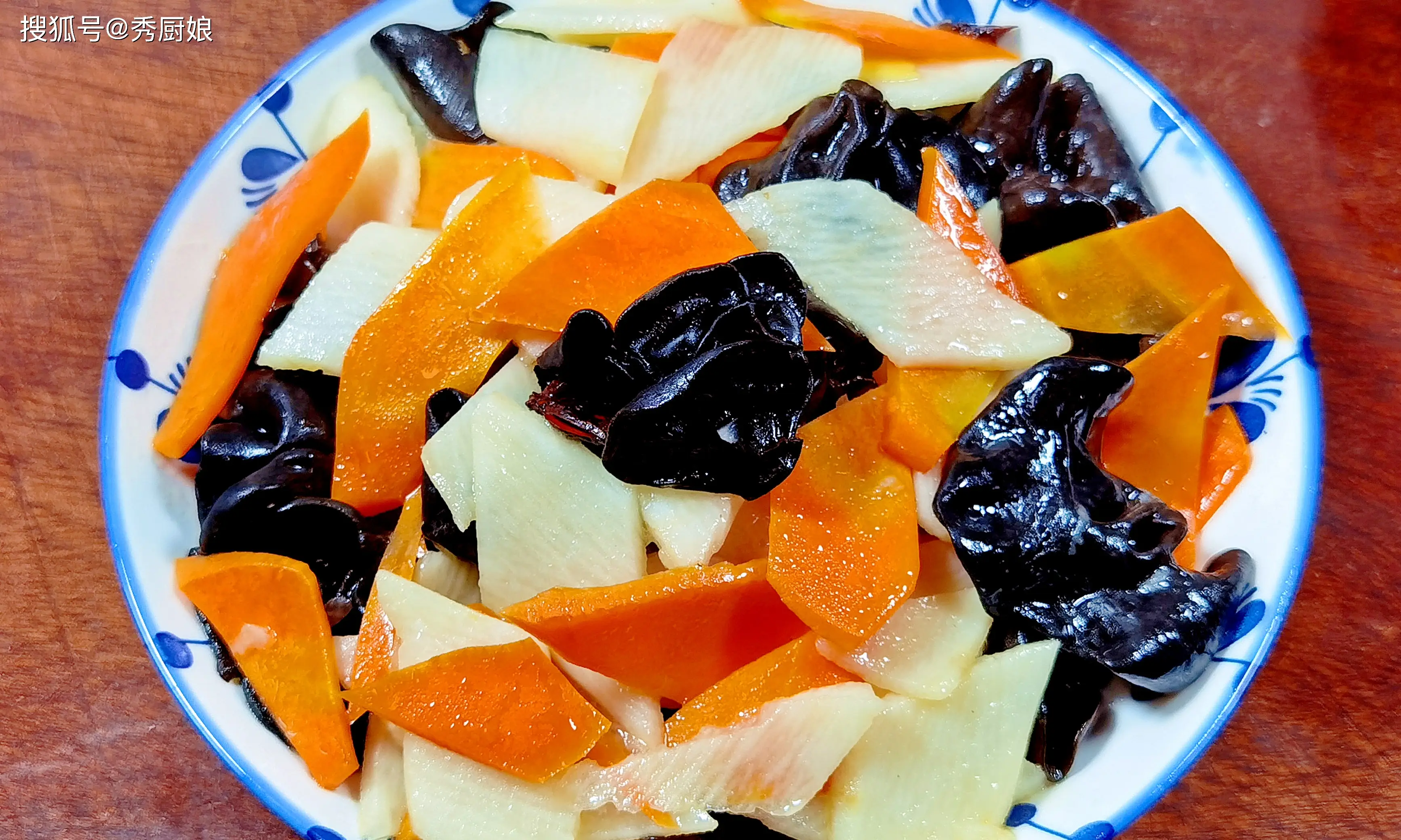 这道菜色彩丰富,看着就很有食欲。山药软糯,胡萝卜和木耳清脆,口感层次非常丰富。清淡的调味最大限度地保留了食材本身的味道,是一道简单又高效的“润肺菜”。