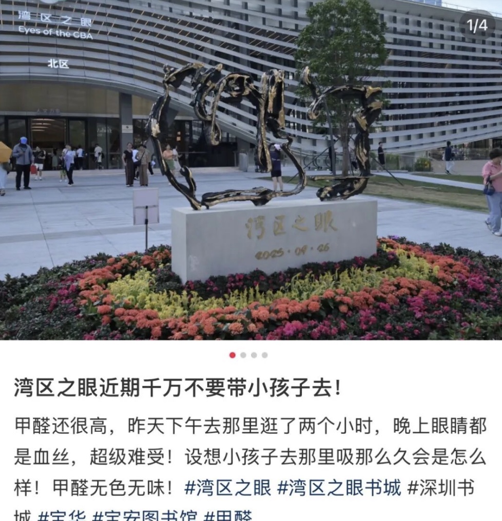 有网友说,“湾区之眼=建筑毒气?带娃避雷,从地下停车场进电梯开始,浓浓的装修毒气熏得人头昏想吐,从南区到北区,一路上各种装修施工车、粉尘、气味”。