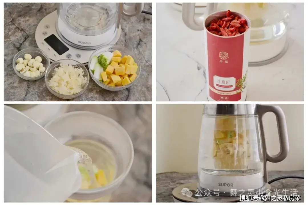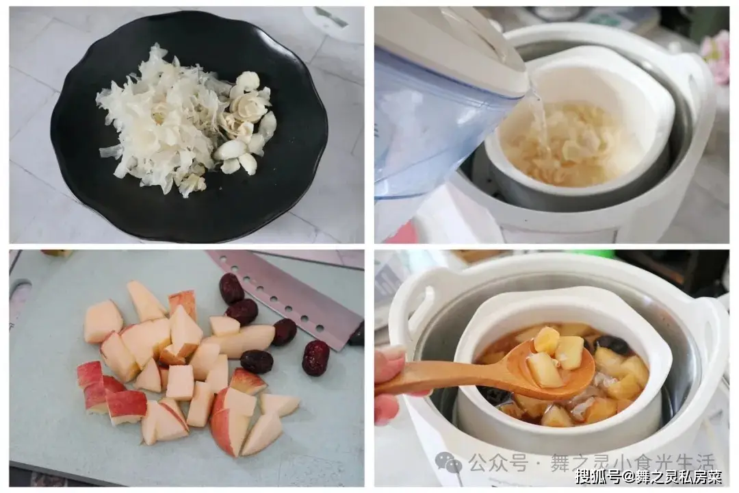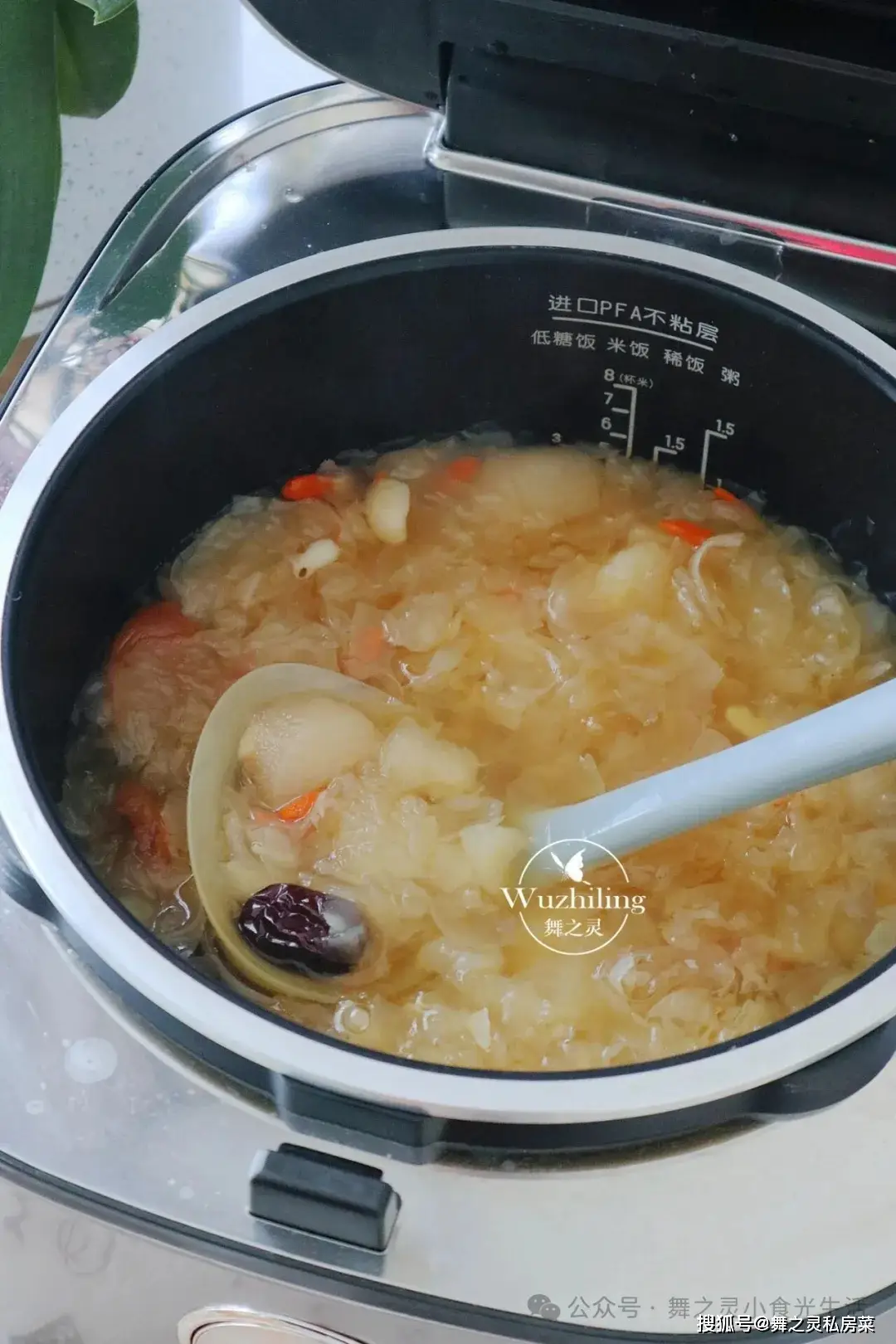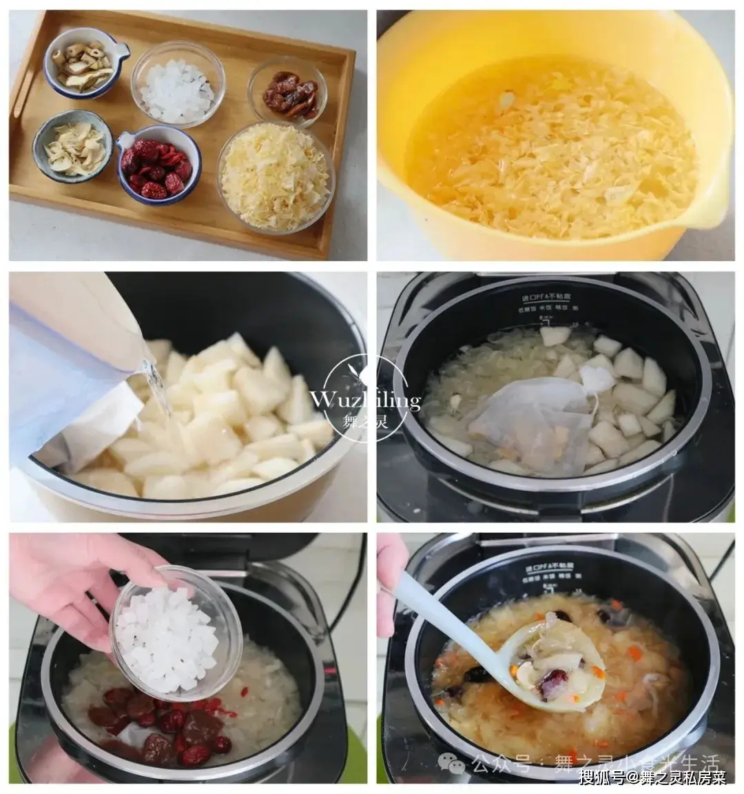 1、银耳要尽量撕碎一些泡发(这样可以更好出胶质),百合浸泡15分钟后一起放入电炖盅,加足了水选择煲汤功能。
