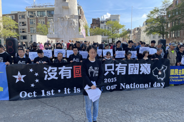 2025年9月28日,荷兰华人在国家纪念碑前齐聚一堂,举行“十一国殇日”集会,强烈谴责中共暴政,并推动“全民反共运动”。图为主持人Erin Duan带领全体为死难者默哀。(反共之声发起人刘飞龙提供)