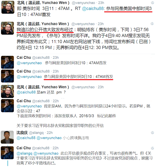 我们假定北风温云超起草了这封公开信,随后北风温云超将此信交给蔡楚的《参与》、韦石的《博讯》、何频的《明镜》等等中文网站,我们再回头来看蔡楚和北风在推特上就传播这封伪造的公开信所做的相互互动。我们不难看到北风温云超和蔡楚两人的那副得意相,那就就如同他们在愚人节共同愚弄了全世界,而全世界都还蒙在鼓里一样,让他们俩得意忘形!