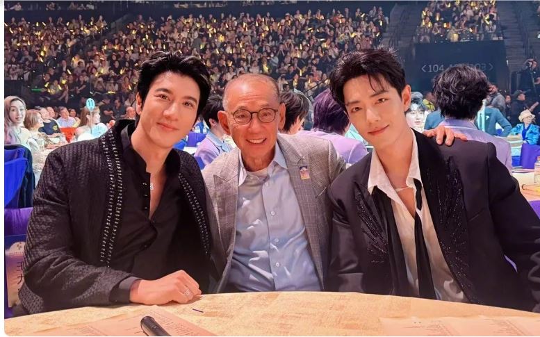 肖战(右)跟王力宏出席大湾区电影音乐晚会,(中)为英皇集团主席杨受成。(图/翻摄自微博)