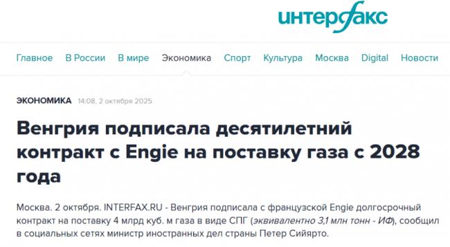 10月2日,俄罗斯官方媒体《国际文传电讯社》报道称,匈牙利外交部长彼得·西雅尔托 (Peter Szijjarto) 在社交网络上表示,匈牙利已与法国 Engie 签署了一份历史上时间最长的天然气长期合同,以液化天然气形式供应 40 亿立方米天然气。该协议将于2028年生效,有效期为10年。