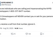 纽约市警察局在X平台上发出警告,提醒市民提防有人假作警方止罪热线电话,骗取民众的个人资料。(NYPD X平台)纽约市警察局(NYPD)近日提醒市民,警惕一种新型电话诈骗。诈骗者假作警方止罪热线(Crime Stoppers)的官方号码1-800-577-8477拨打电话,企图套取...